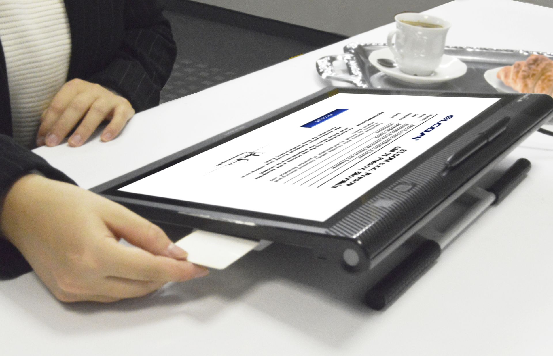 Diskrétne a bezpečné riešenie, pri ktorom má klient všetko podstatné pod kontrolou. Displej umožňuje biometrický podpis na celej obrazovke a zväčšenie dokumentu. Pravosť podpisu sa overuje pomocou sofistikovaného softvéru, ktorý meria tlak, rýchlosť, zrýchlenie a dĺžku podpisu. Faktory, ktoré si ľudské oko za žiadnych okolností nevšimne. Tento špeciálny proces je bezpečnejší ako štandardné podpisovanie na papieri.